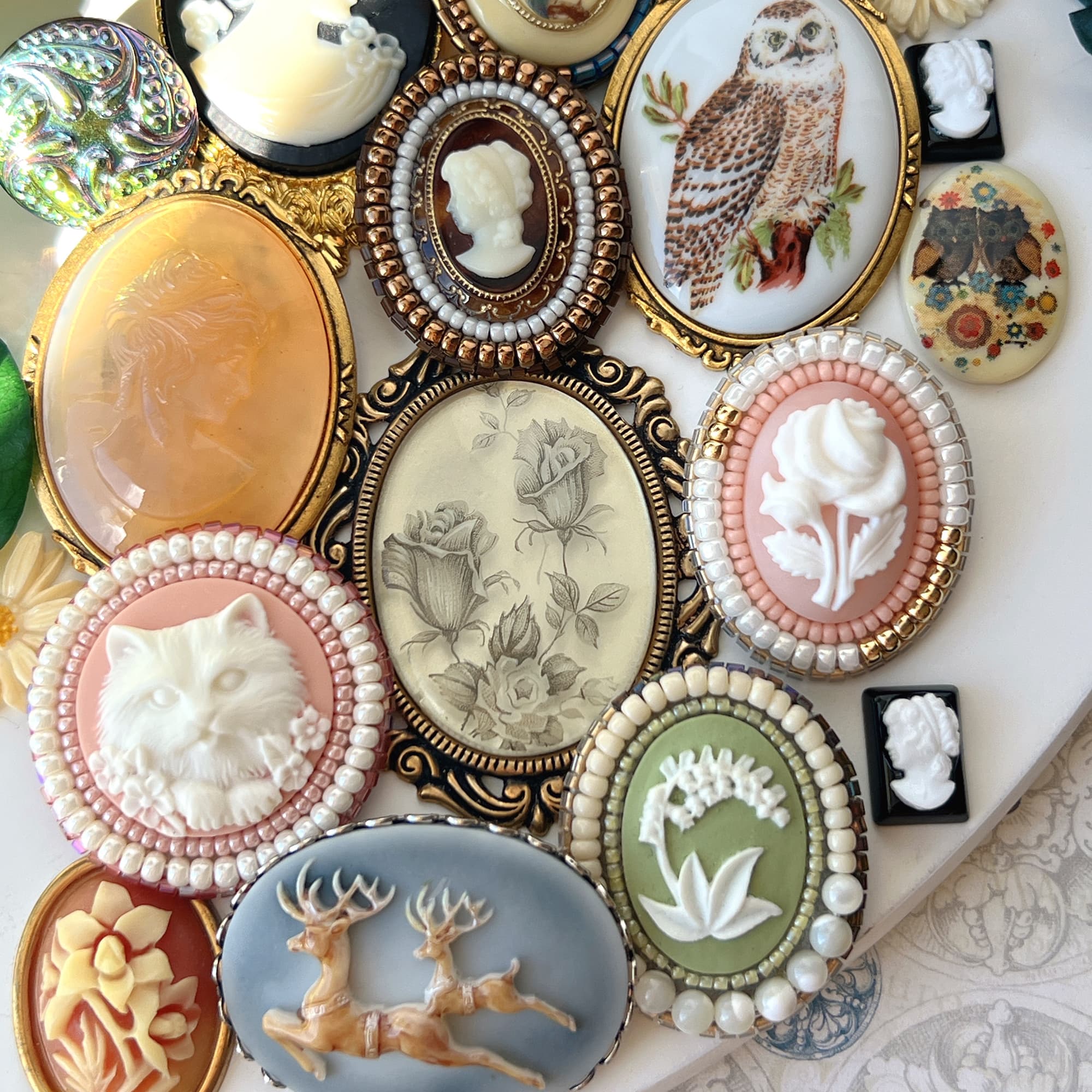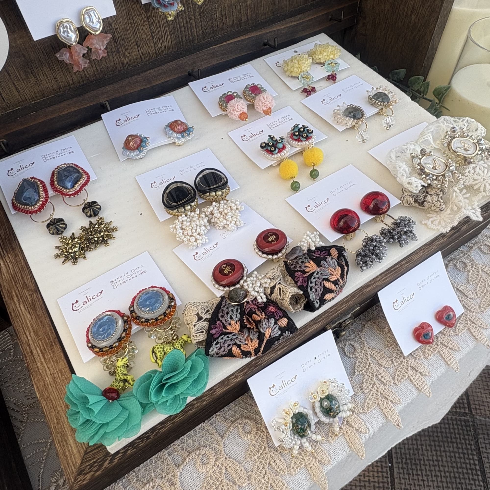 レトロなアンティークリボン、色彩豊かな美しいチェコビーズ、グラデーションに徹底的に拘ったレジン……世界中の「かわいい」をワカナのアトリエの世界観で再構成!新たなアクセサリーに仕立ててお届けします!
