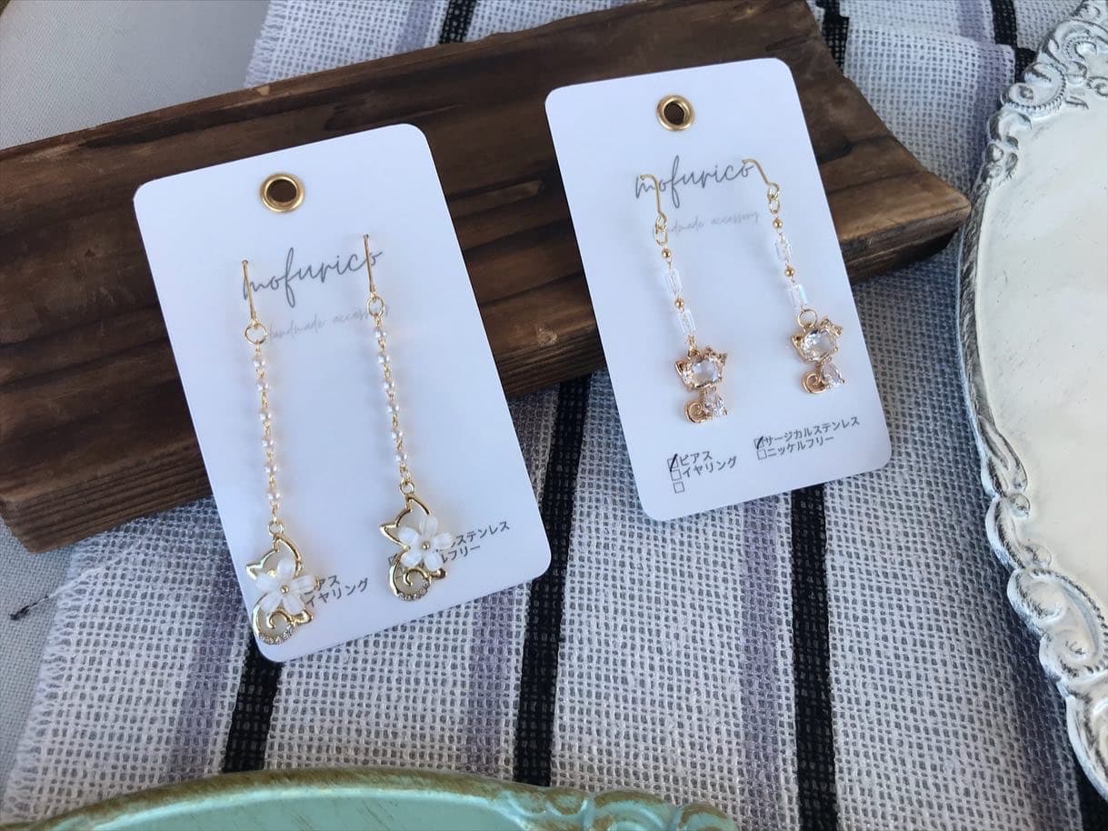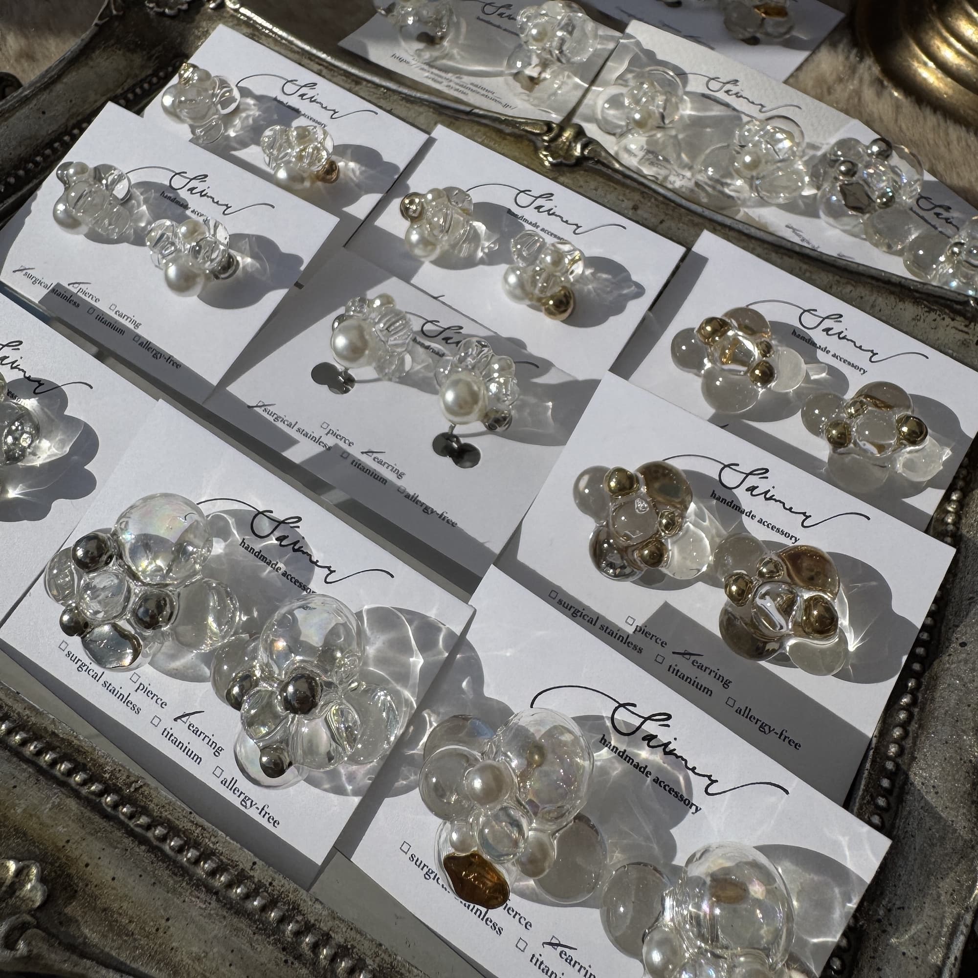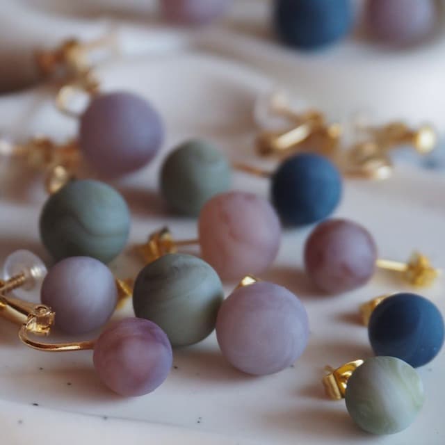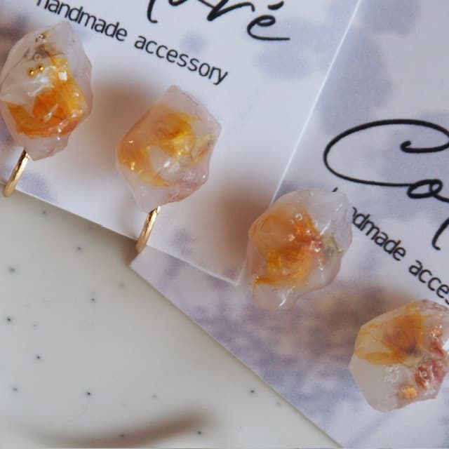 ガラスのような透明感と艶。クリアなのにキラキラと輝き、自慢のうる艶が遠くからでも目を惹きます。ゴールドやパールを使った作品を多数ご用意しております。カジュアルにもフォーマルにも合わせやすい大人可愛いアクセサリー是非ご覧ください。