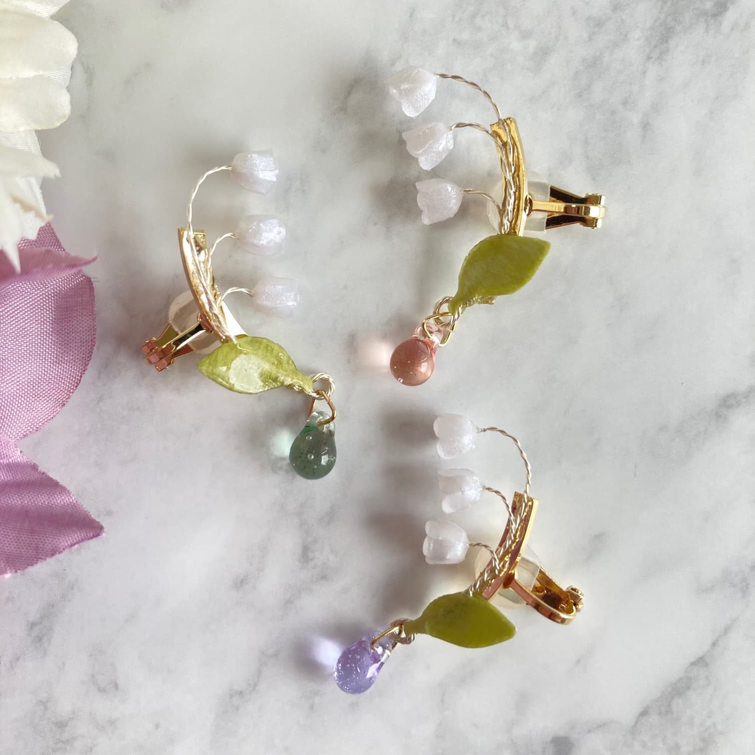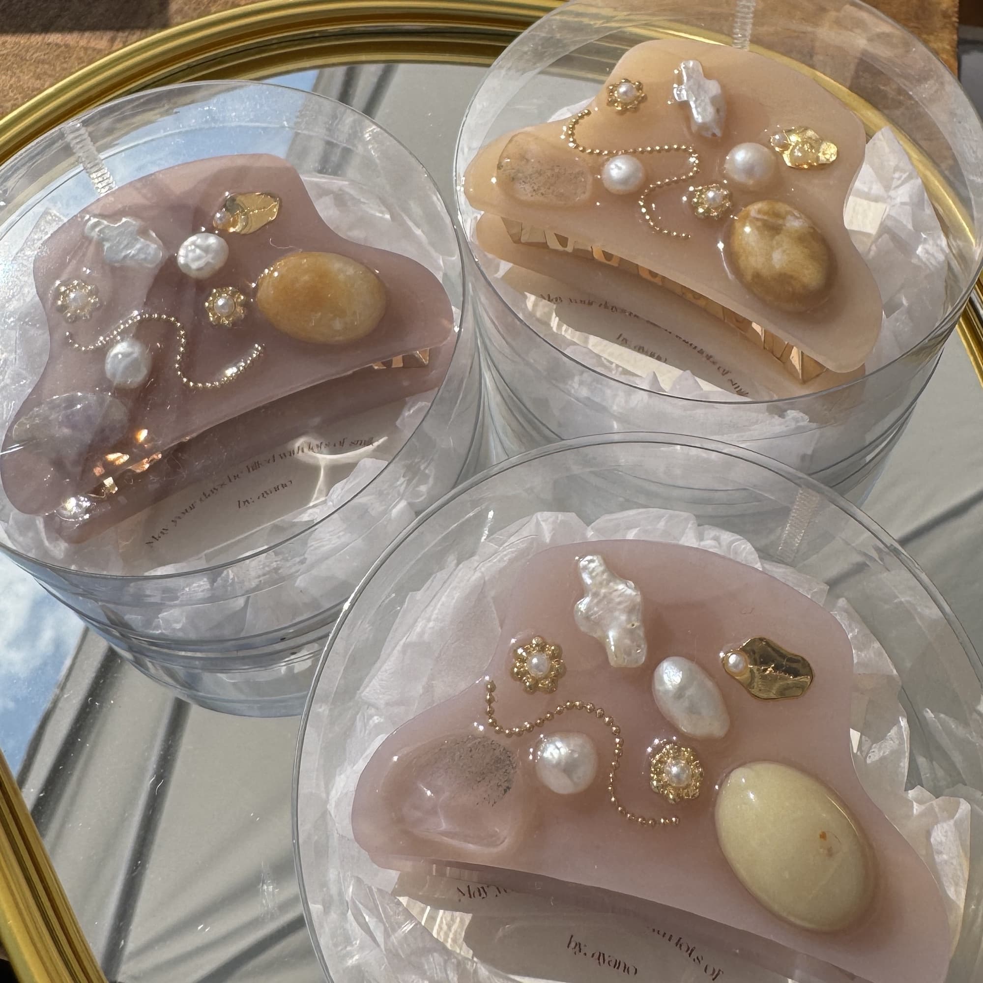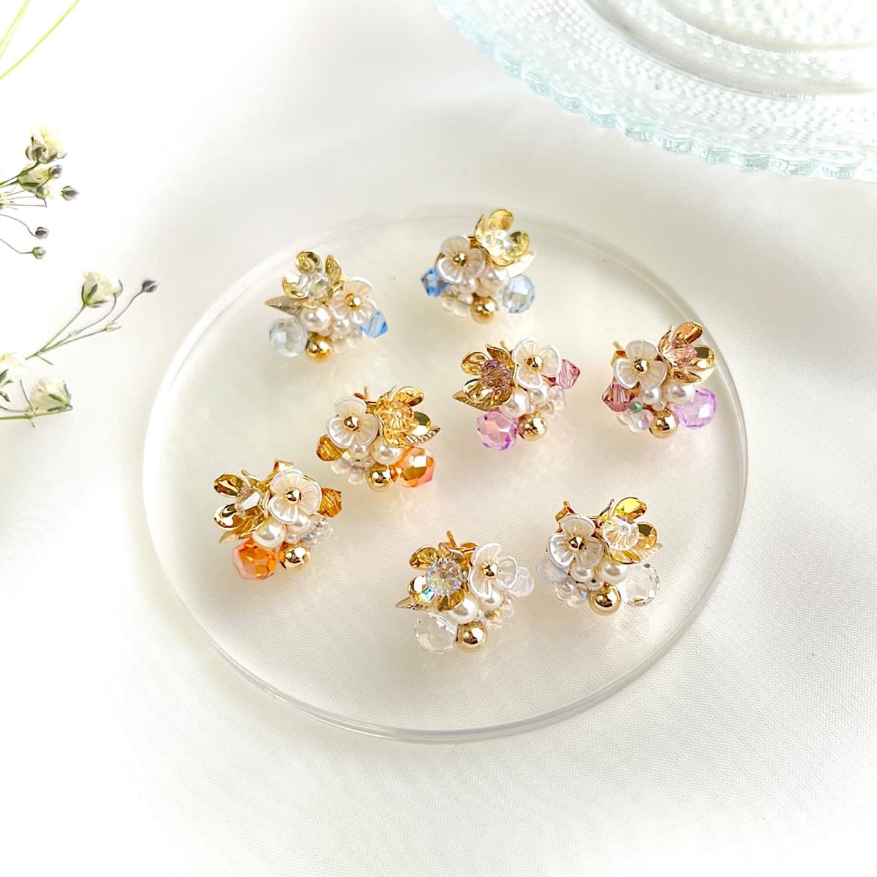 ガラスのような透明感と艶。クリアなのにキラキラと輝き、自慢のうる艶が遠くからでも目を惹きます。ゴールドやパールを使った作品を多数ご用意しております。カジュアルにもフォーマルにも合わせやすい大人可愛いアクセサリー是非ご覧ください。