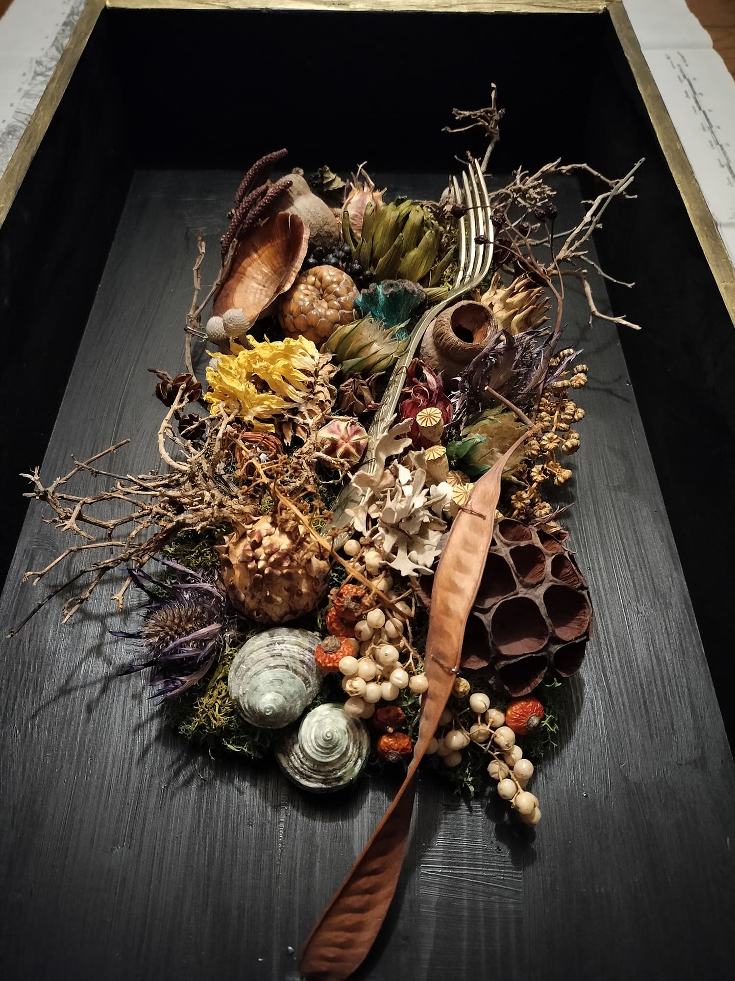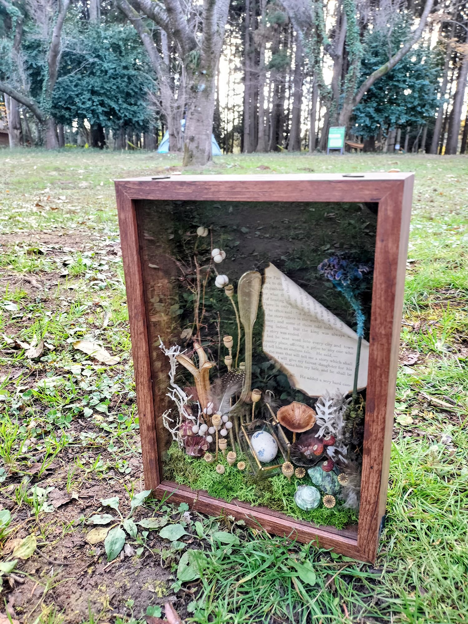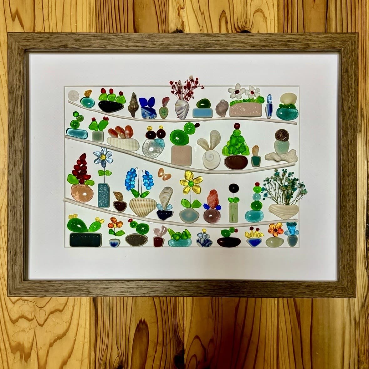 ドライフラワーやアンティークパーツ・スプーンやフォーク・ガラス瓶•貝や鳥の羽根・英字新聞や日めくりカレンダーの切れ端など、身近にある色々なモノを混ぜ合わせてフレームを作っています。