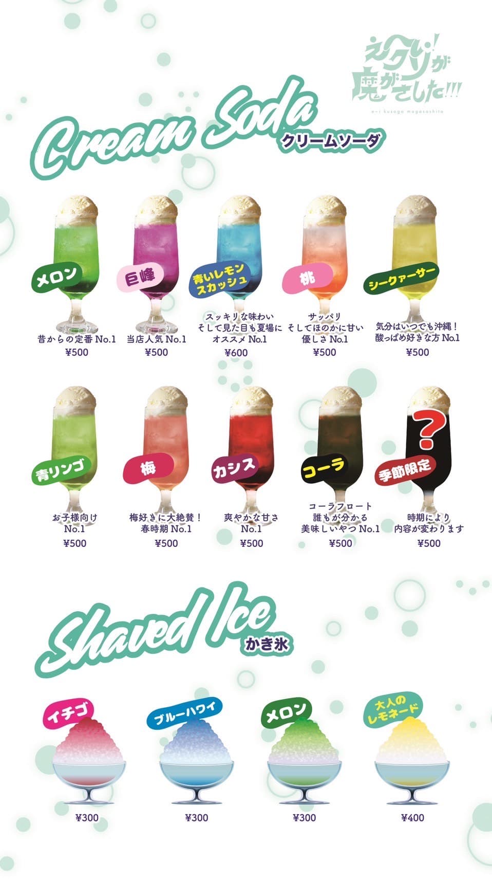 オススメメニューは10種類の味から選べるオリジナルクリームソーダです。