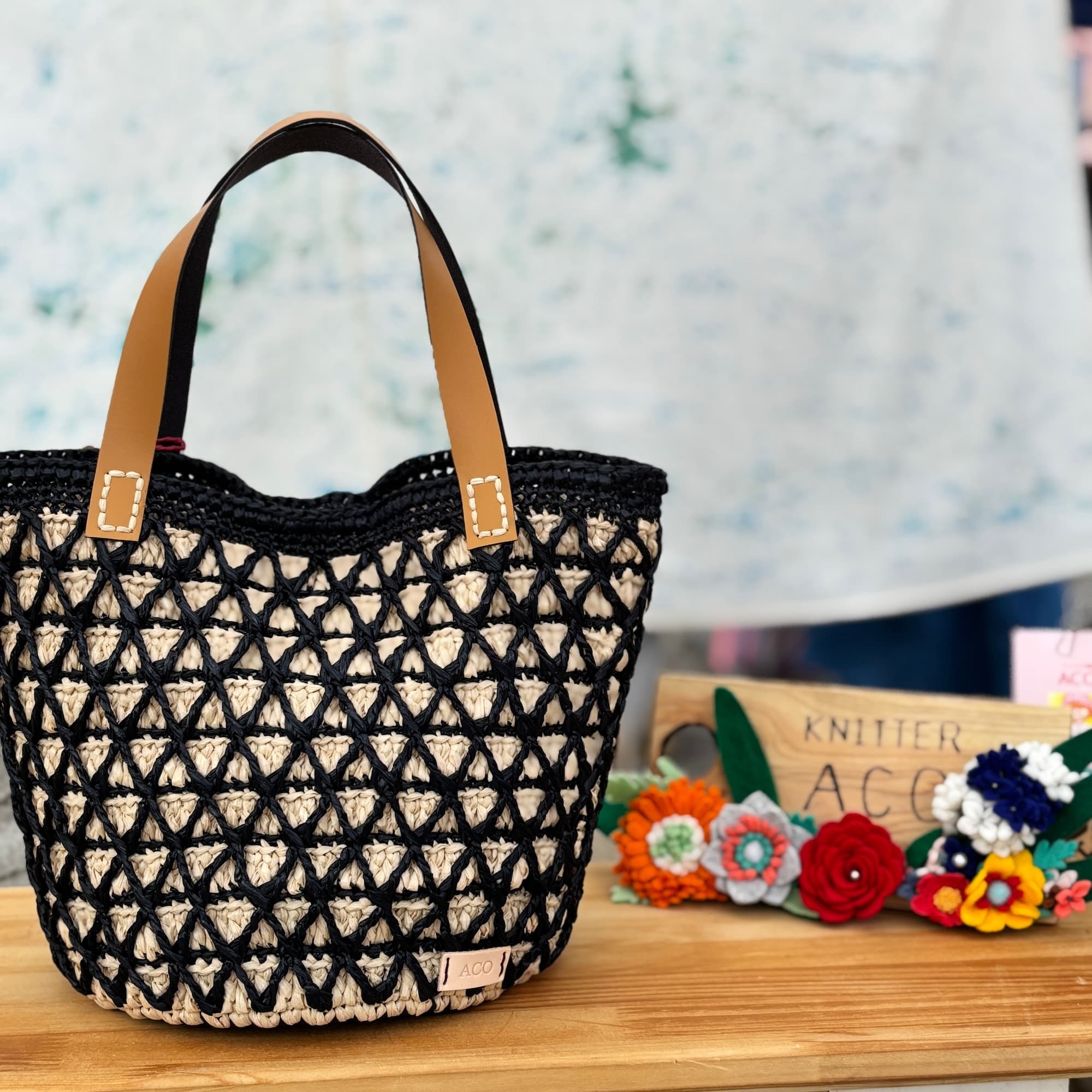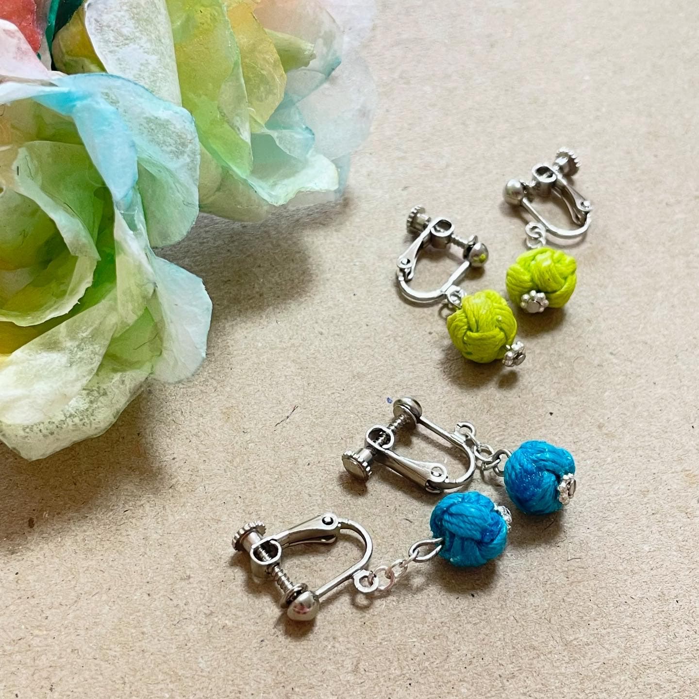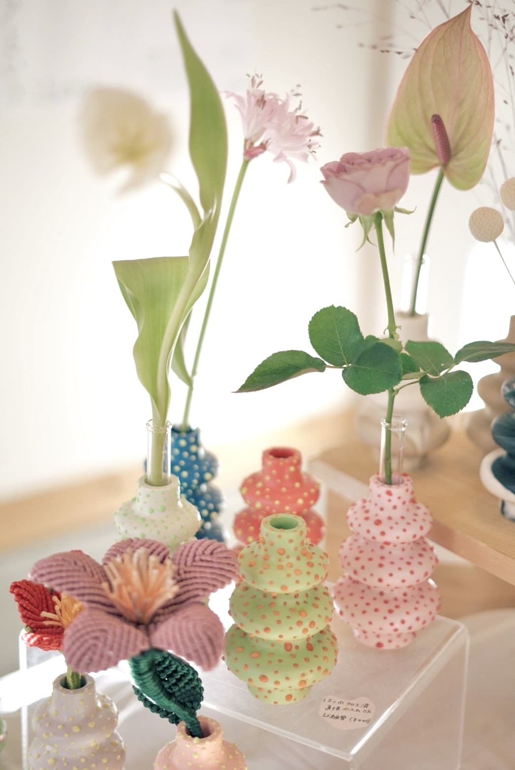 春の彩りを編み込んだニット小物。中には自ら染め上げた糸を使用し、春らしい色合いで丁寧に編み込んだ小物もあります。季節のぬくもりと手編みの温かみを感じていただけるよう、心を込めて制作しています。