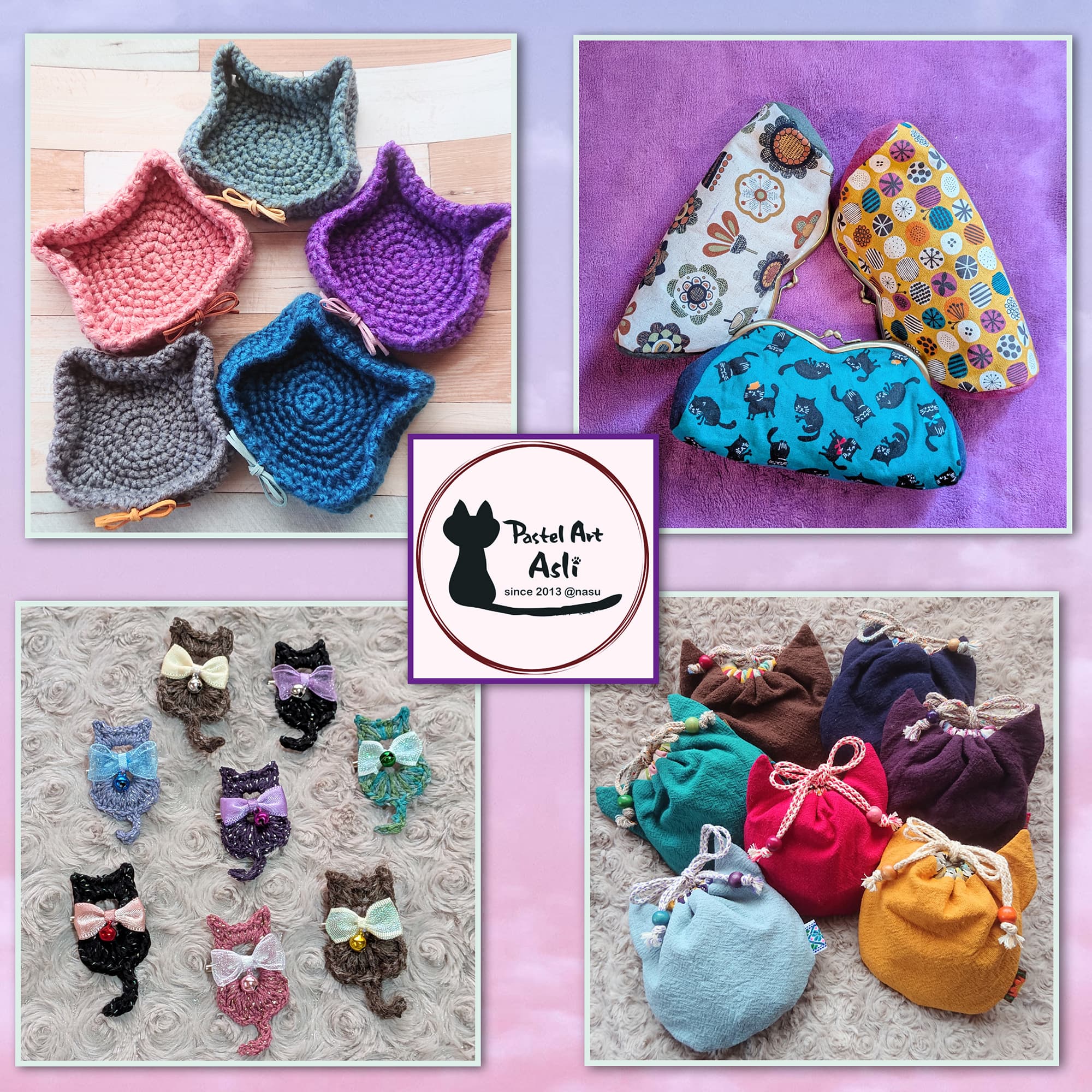 猫ちゃん柄の生地で布小物を作ったり、ねこちゃん編みぐるみなど可愛い猫ちゃんの小物を作っています。お子様から大人の方まで楽しめるような作品や使いやすいがま口など色々と当日はお持ちします。皆様のお越しをお待ちしております。
