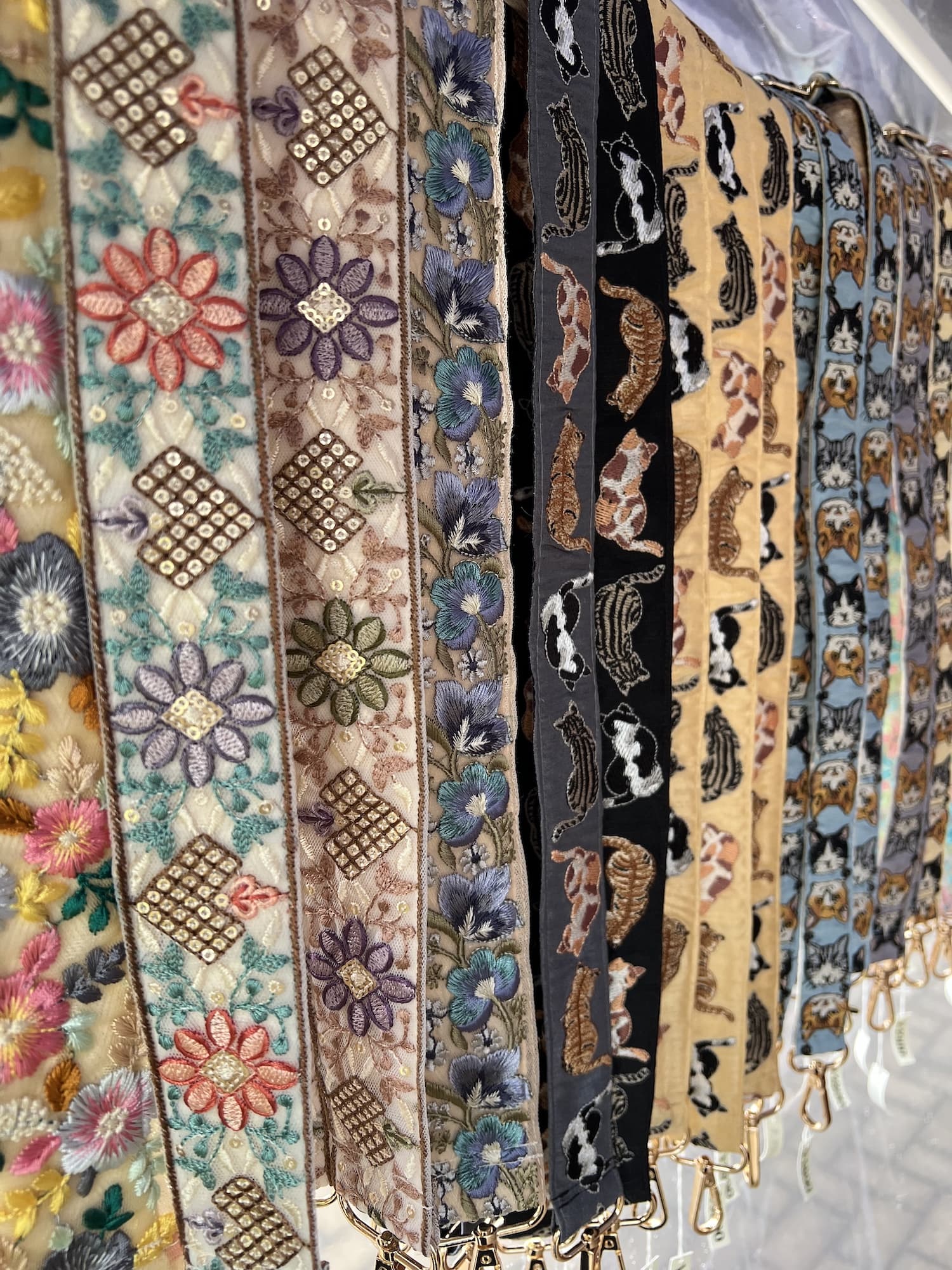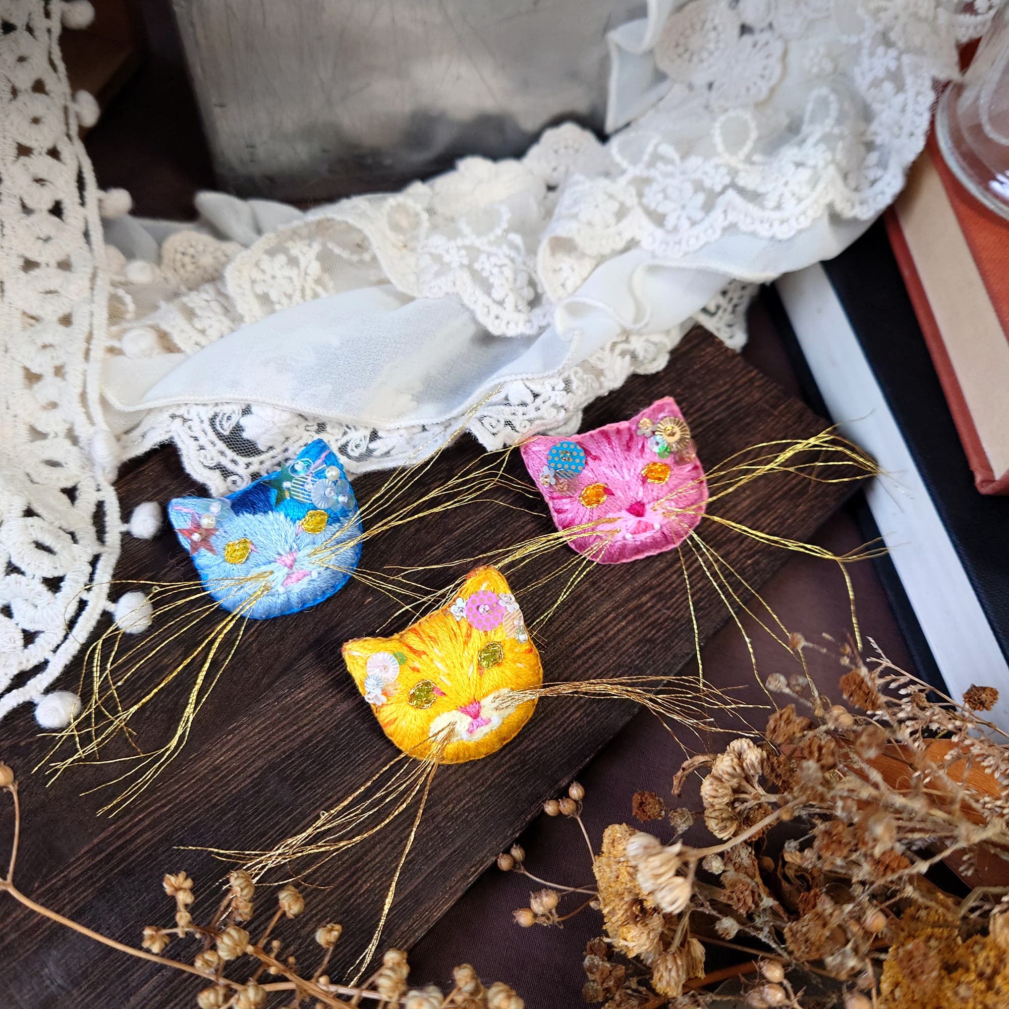 インド刺繍リボンを使った可愛いニャンコポーチ、ニャンコキーホルダー♡ 魔法使いのにゃんこブローチシリーズ♡ぜひ手にとって見て頂けたら嬉しいです。🐈⬛