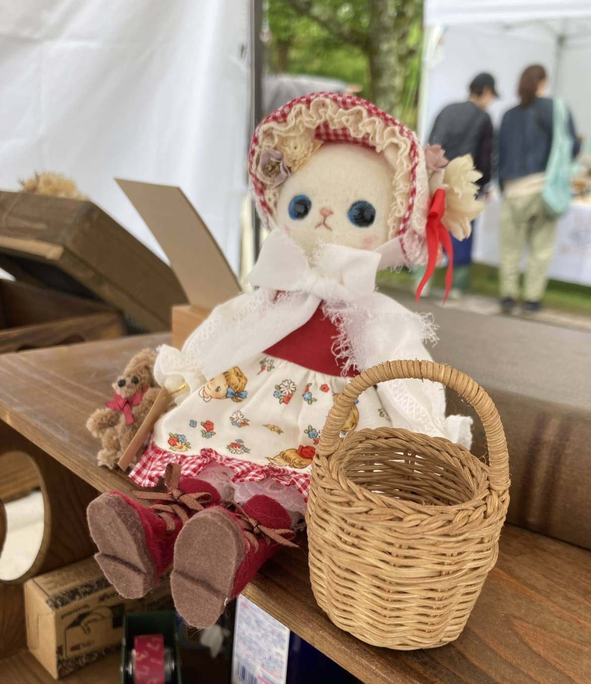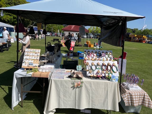 青空のもとで開催されているマルシェでは、さまざまな作家さんのテントが並び、色とりどりの作品が広場を彩っています。