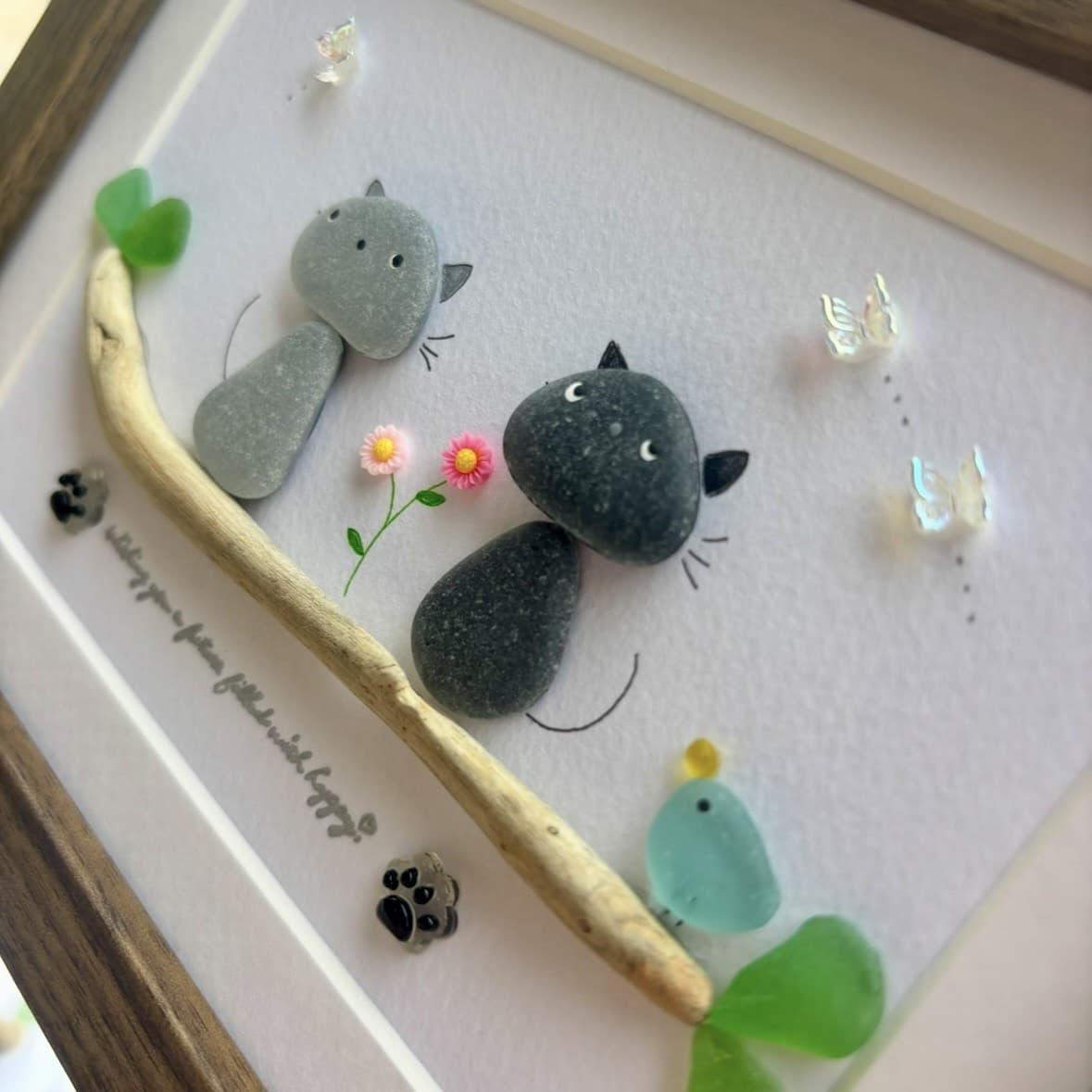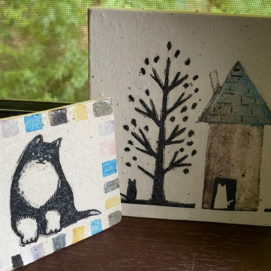 猫と自然をモチーフに、紙・布・小石・糸・アクリル板など多様な素材を用いた絵画作品・刺繍小物・オリジナルグッツをご紹介します。