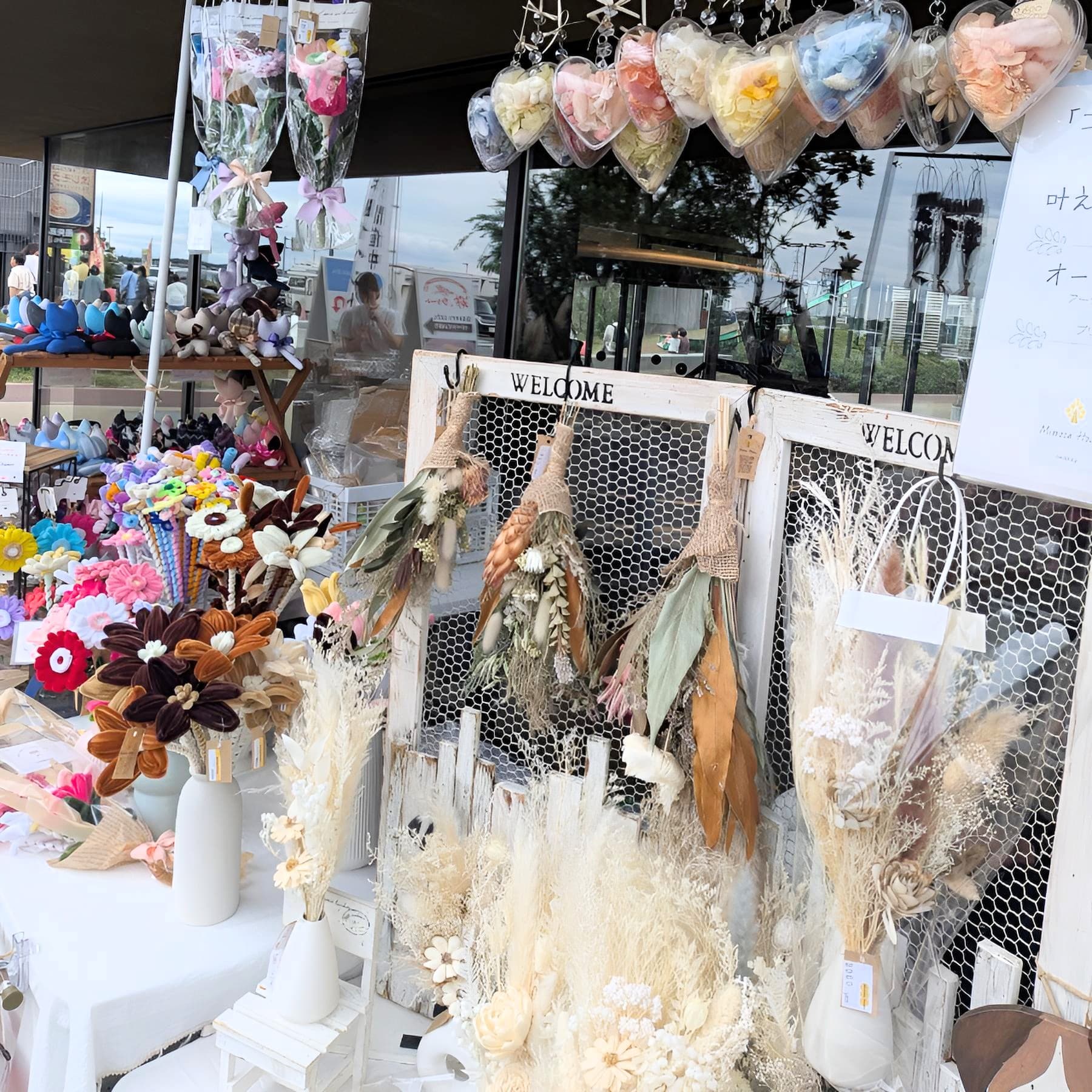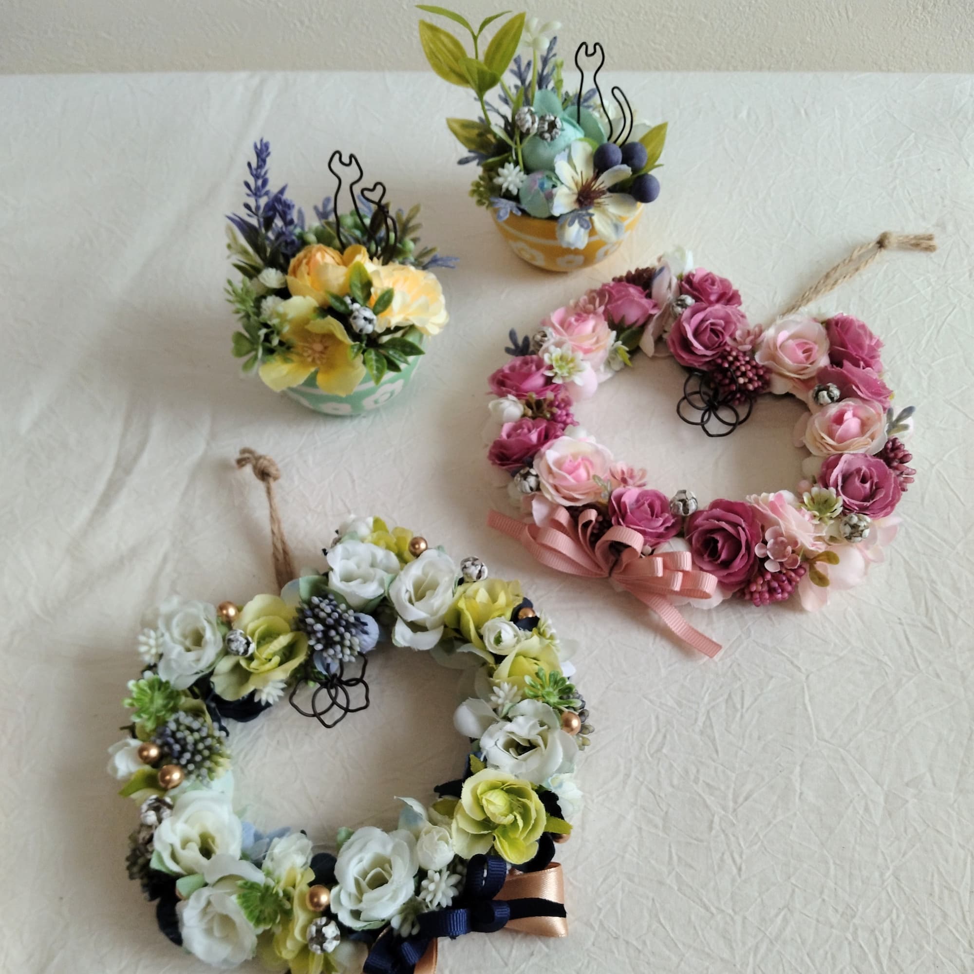 アーティーフィシャルフラワーを使いアレンジやリースを作っています。猫の豆絞り手拭いや竹細工、ドライフラワーなども有りますので見に来て下さい。