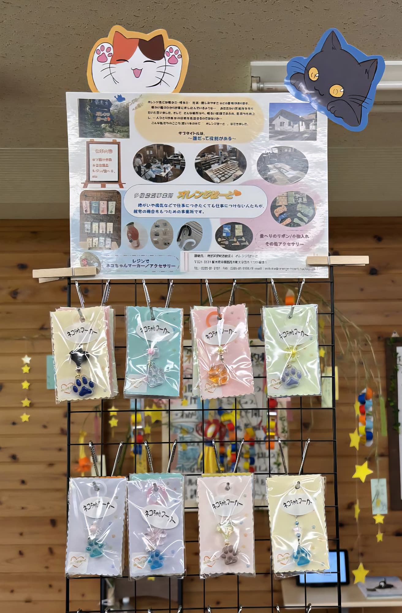 オリジナルレジンパーツとバラなどのお花をあしらったアクセサリーが人気のRoseと、猫柄の記生地を使用したカチューシャや猫耳ニット帽のGRAiNEのお店。就労継続支援B型カラフルの利用メンバーさんの猫の絵画も展示販売します。