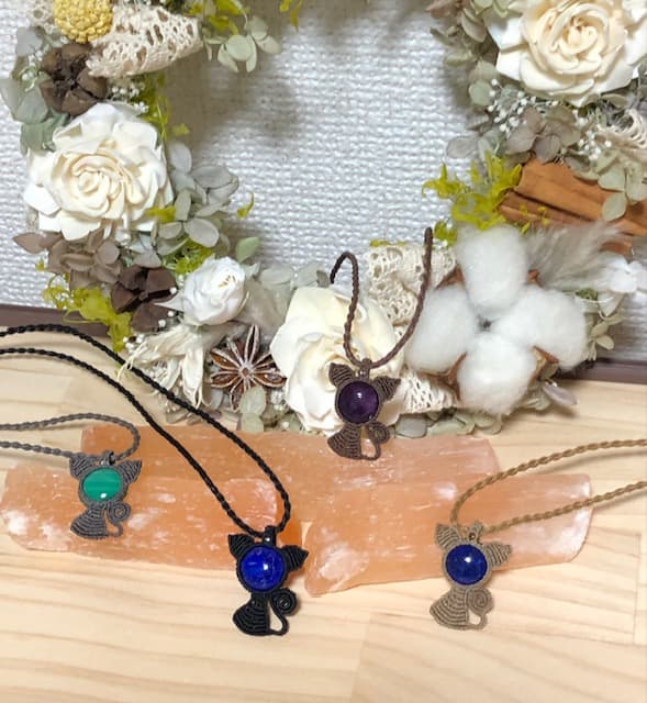 天然石マクラメアクセサリーを中心にネコモチーフ、ネコ柄布小物、パンダ柄布小物などを出品予定です。ひとつひとつ丁寧に納得いく作品に仕上げています。ステキな出会いがありますように✨
